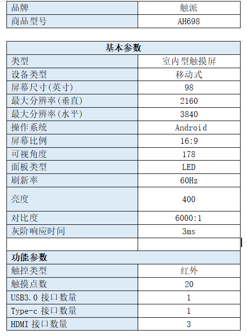 介紹 觸控功能:紅外20點觸摸; 電腦配置:i7,8G,256G; 電源電壓:AC110-240V; 屏幕比例:16:9; **分辨率(垂直)2160; **分辨率(水平)3840; 可視角度:178; 面板類型:LED; 刷新率:60Hz; 亮度:400; 對比度:6000:1; 灰階響應時間:3ms;